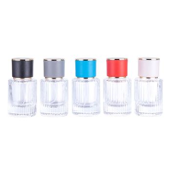 Mini botella de perfume de bolsillo de 30mL, botella de perfume de cristal transparente, cabezal de pulverización dorado y plateado, tapa en forma de cubo, tapa de rosca